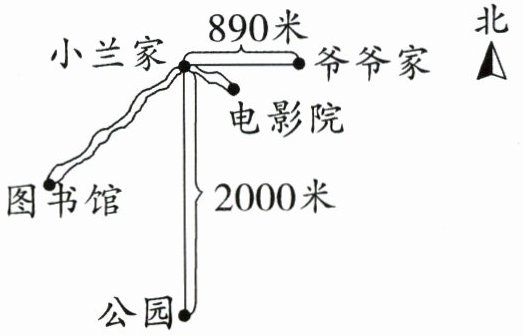 (3)从小兰家到爷爷家的距离是从电影院到小兰家的距离的2倍。小兰的爸爸看完电影回家,向( )方向走了5分钟才到家。小兰的爸爸平均每分钟走多少米?(4分)