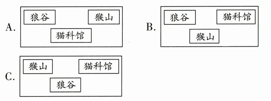2. 动物园中,猴山在猫科馆的西南方向、狼谷的东南方向。下面图中符合描述的是( )。