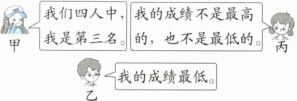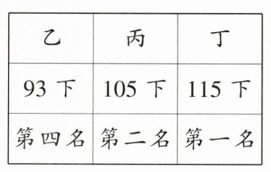 3. 新素养 推理意识 甲、乙、丙、丁四人进行1分钟跳绳比赛,成绩是105下、103下、115下、93下。根据对话把表格填完整。(12分)