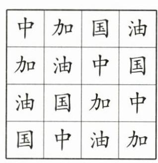 4. 在右面的方格图中,每行、每列都有“中”“国”“加”“油”这四个汉字,并且每个汉字在每行、每列都只出现一次,把方格图填写完整。(10分)