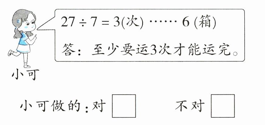 4. 新趋势 评价说明 有27箱菠萝,叔叔每次运7箱,至少要运几次才能运完?下面是小可的做题过程,在 里画“√”并说说你的想法。(5分)