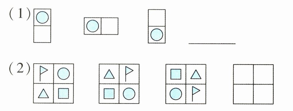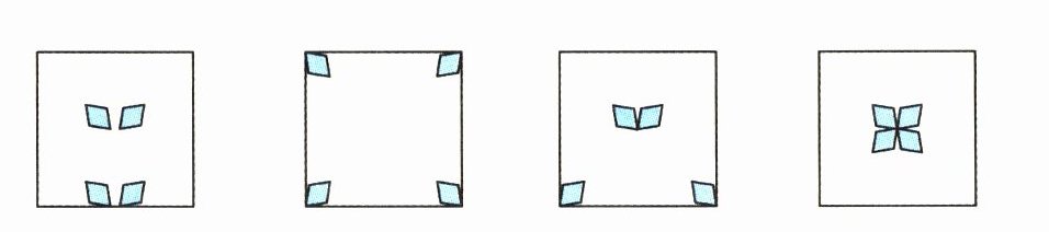 像上面这样把一张正方形纸对折两次,剪出如图所示的图形后展开,得到的图案会是哪一个?把它圈出来。(4分)