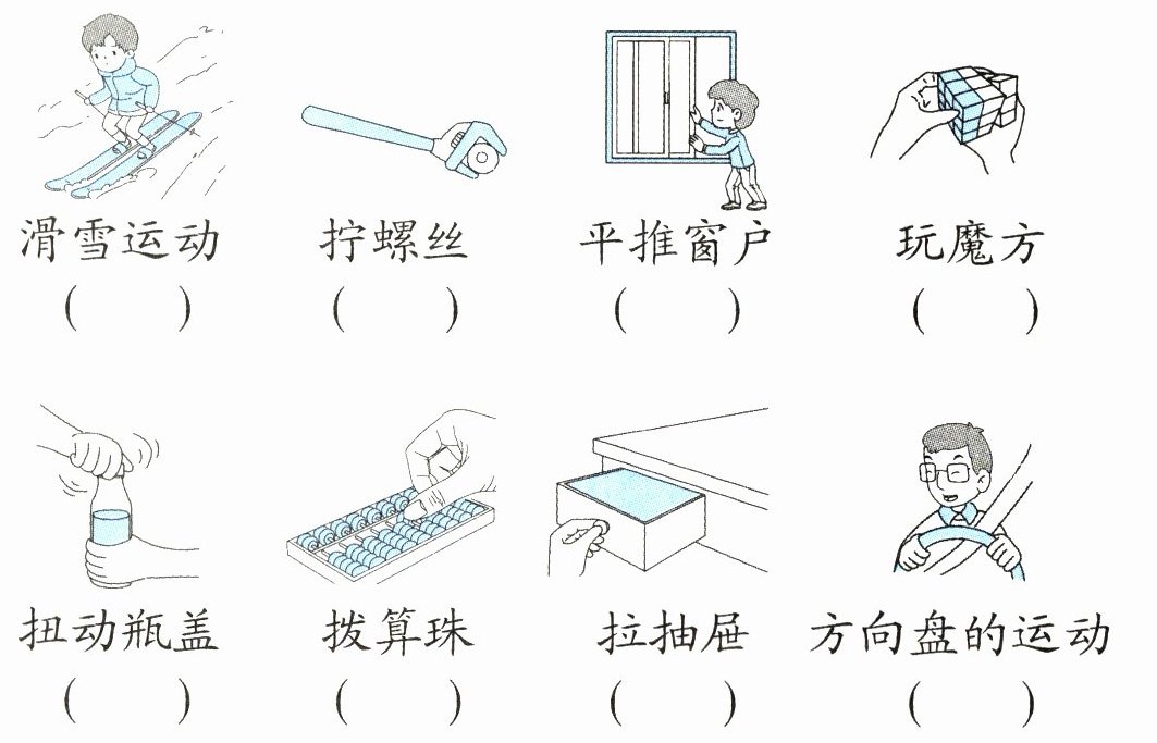 2. 下面这些运动的方式是平移还是旋转?是平移的在括号里画“→”,是旋转的在括号里画“〇”。(16分)