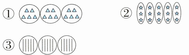 2. 红团是莆田的传统喜庆节日食品。王叔叔买了15个红团,平均装在3个盘子里,每个盘子里放几个红团?下面画图不正确的是( )。