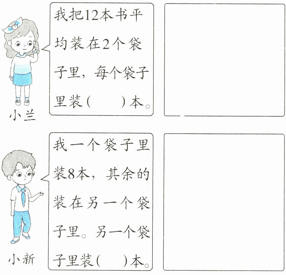 五 新趋势 算理理解 小新和小兰分别拿12本书装在2个袋子里。请你将他们的分装方法补充完整,并用画图的形式表示出来。(6分)