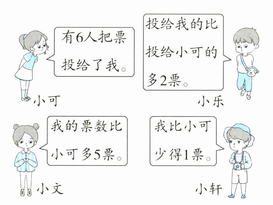 七 二(3)班要选班长,有四名同学参与了竞选。同学们用投票的方式来决定谁当班长,投票情况如下。(每位同学只能投1票)(共15分)