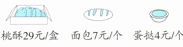 (1) 买1盒桃酥和3个面包,一共要付多少钱?(5分)