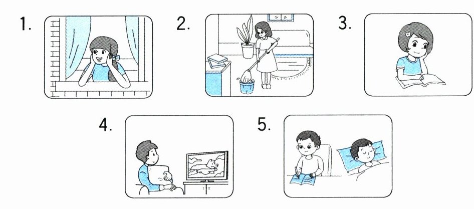1. stayed at home 2. cleaned her room 3. read 4. watched TV 5. did; homework; slept