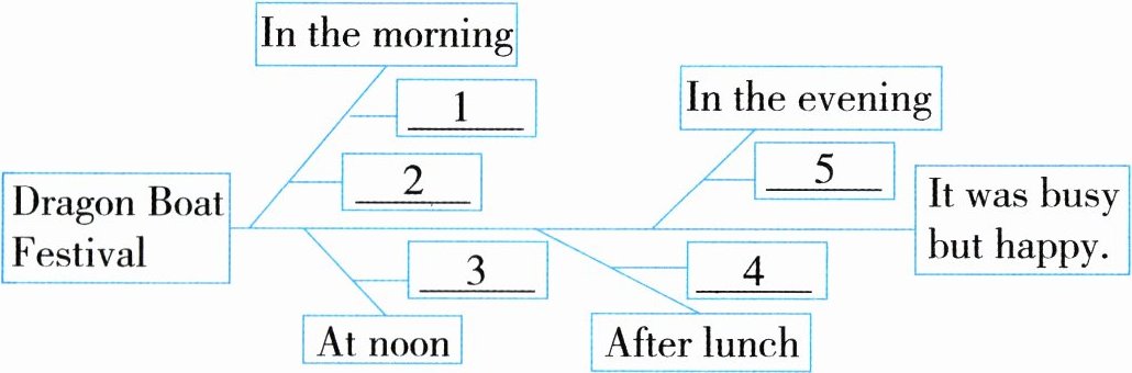 1. did homework 2. listened to the story 3. helped Mum make rice dumplings 4. cleaned the room 5. watched TV with best friend