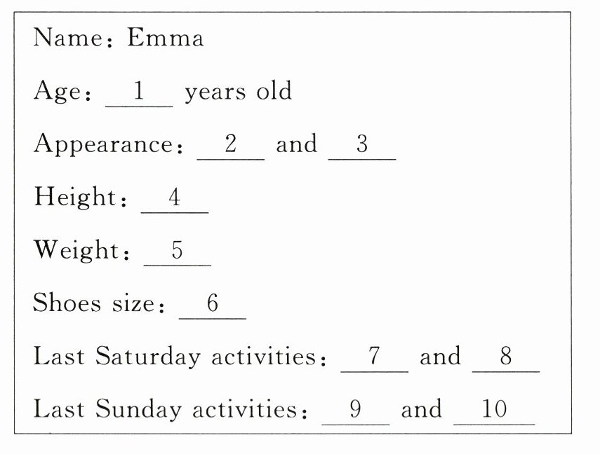 八 听录音,选择正确的选项补全表格,将序号填在题前括号中。(听两遍)