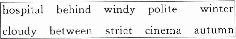 1. windy; cloudy 2. behind; between 3. winter; autumn 4. polite; strict 5. hospital; cinema
