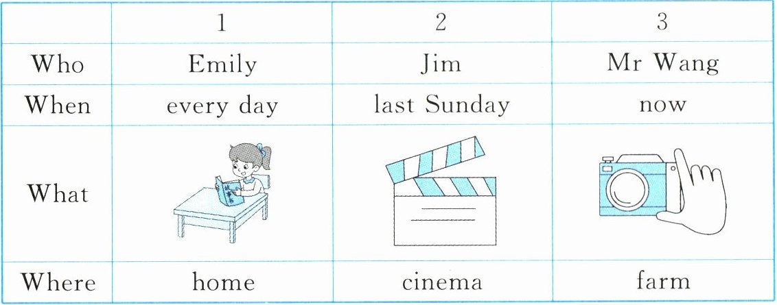 1. Emily reads storybooks at home every day./Emily stays at home and reads storybooks every day. 2. Jim saw a film in the cinema last Sunday./Jim went to the cinema and saw a film last Sunday. 3. Mr Wang is taking pictures on the farm now.