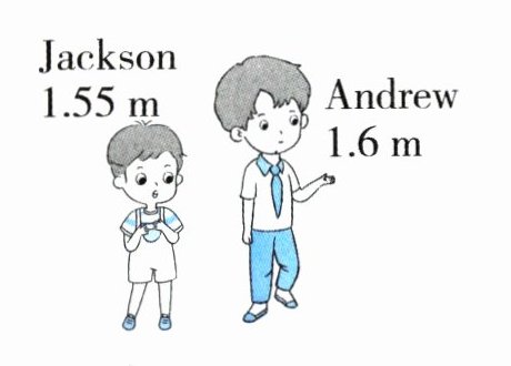 Andrew is 1.6 metres. Jackson is 1.55 metres. Andrew is taller than Jackson.