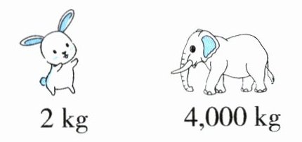 1. The rabbit is 2 kilograms. The elephant is 4,000 kilograms. The elephant is heavier than the rabbit.