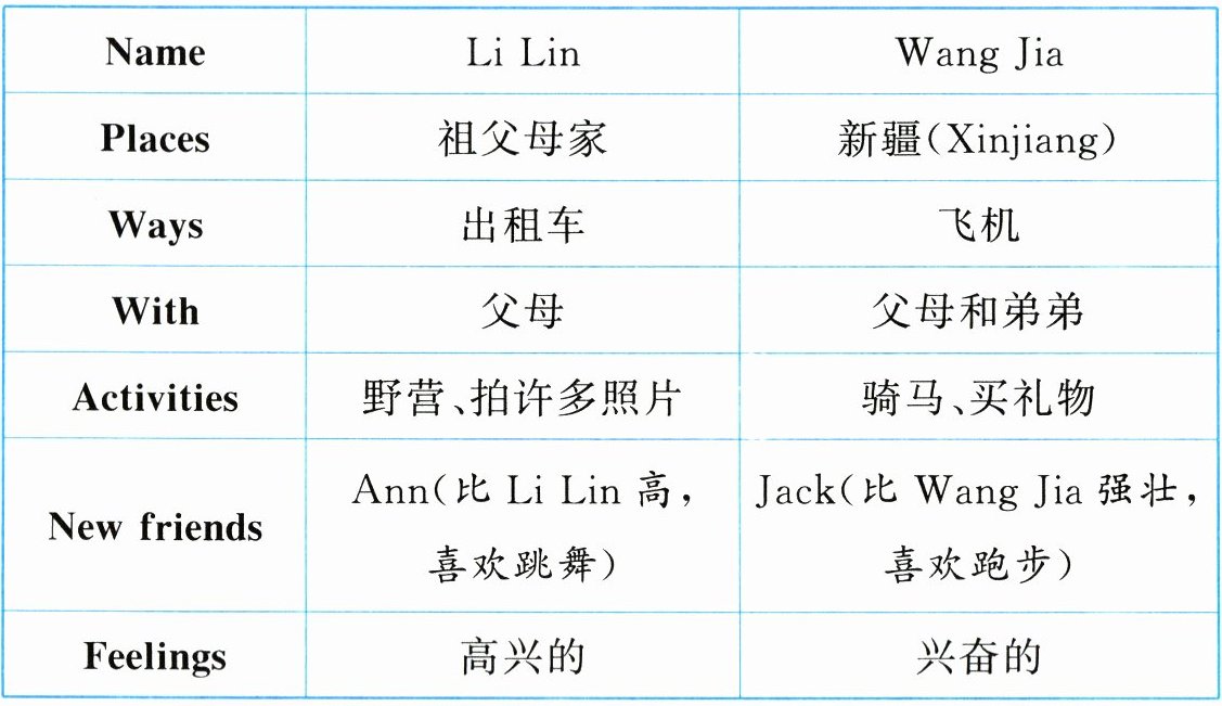 七 Li Lin 和 Wang Jia 在网上交流五一假期的经历。请根据表格信息,先填空补全 Li Lin 的经历,再仿写 Wang Jia 的经历。