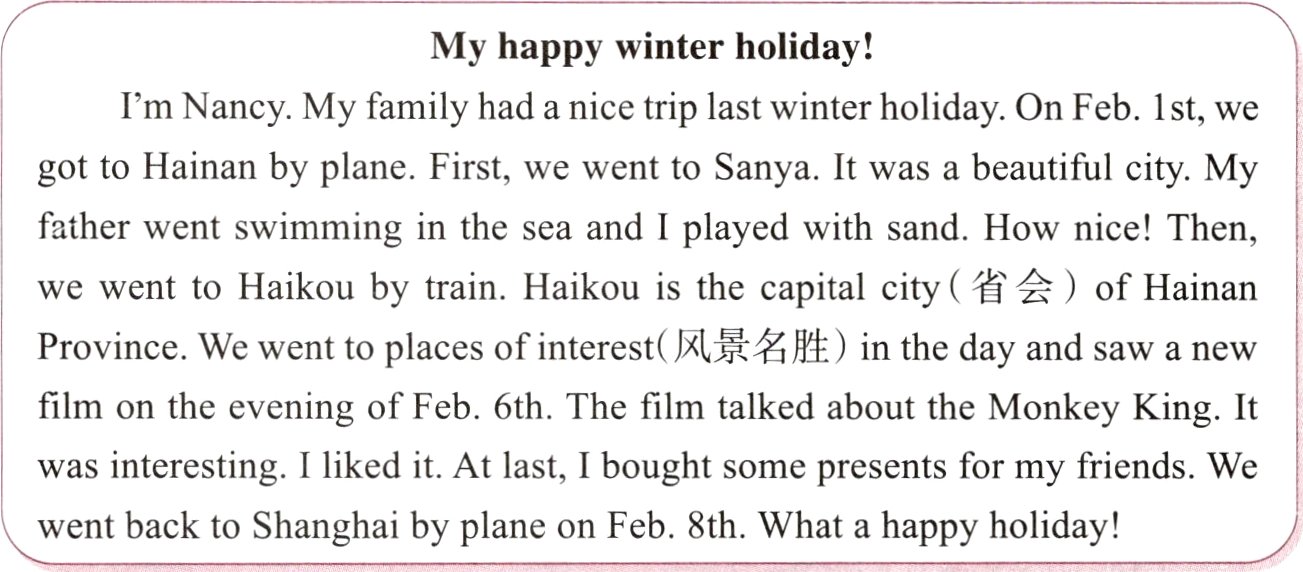 I’m Nancy. My family had a nice trip last winter holiday. On Feb. 1st, we got to Hainan by plane. First, we went to Sanya. It was a beautiful city. My father went swimming in the sea and I played with sand. How nice! Then, we went to Haikou by train. Haikou is the capital city (省会) of Hainan Province. We went to places of interest(风景名胜) in the day and saw a new film on the evening of Feb. 6th. The film talked about the Monkey King. It was interesting. I liked it. At last, I bought some presents for my friends. We went back to Shanghai by plane on Feb. 8th. What a happy holiday!