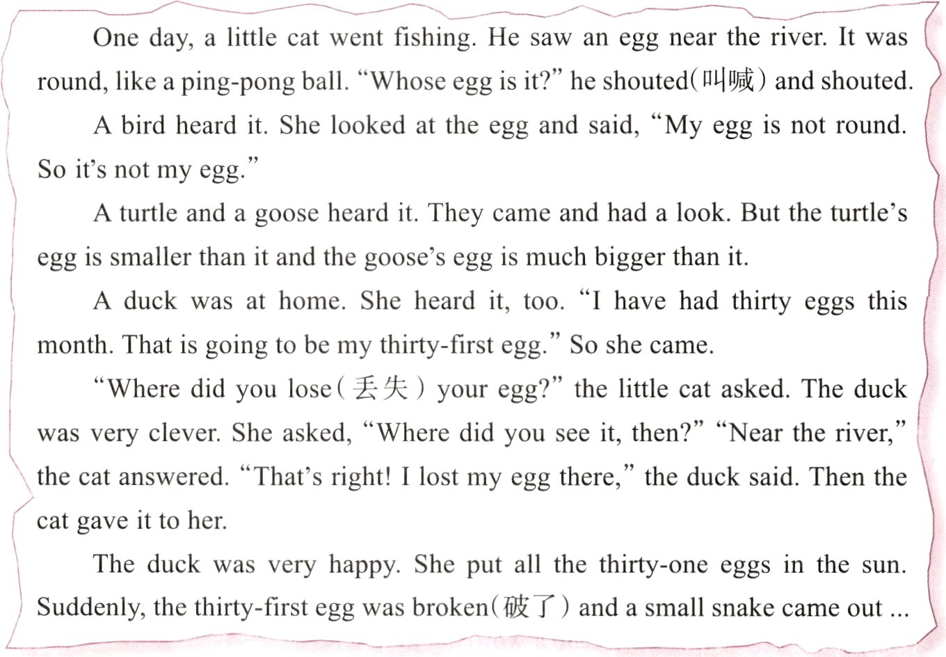 “Where did you lose(丢失) your egg?” the little cat asked. The duck was very clever. She asked, “Where did you see it, then?” “Near the river,” the cat answered. “That’s right! I lost my egg there,” the duck said. Then the cat gave it to her.
