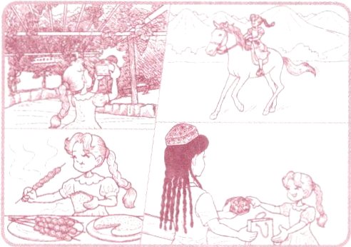 Here are some photos from Barbara. Last summer holiday, Barbara ______ to Turpan. She ______ lots of grapes and ______ some pictures. She ______ some mutton and Nang Pancakes(馕饼). She ______ a horse there. That was so cool. She also ______ some souvenirs (纪念品).