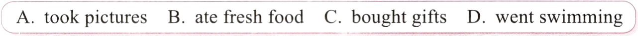 A. took pictures B. ate fresh food C. bought gifts D. went swimming