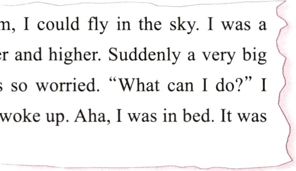 I had a dream last night. In my dream, I could fly in the sky. I was a small bird. That was so funny. I flew higher and higher. Suddenly a very big bird saw me, and tried to catch me. I was so worried. “What can I do?” I thought. “I want to go back home.” Then I woke up. Aha, I was in bed. It was all a dream!