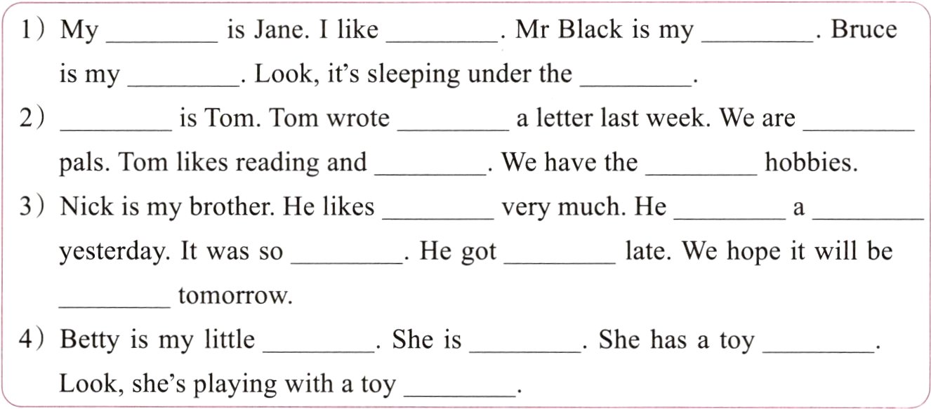 2) ______ is Tom. Tom wrote ______ a letter last week. We are ______ pals. Tom likes reading and ______. We have the ______ hobbies.