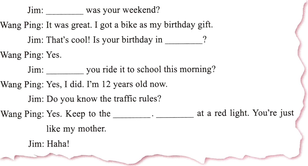 It is a special day for me today. Dad and Mum got up early. Dad went to the supermarket and bought some vegetables, fish, beef and fresh fruit. I helped Dad wash the vegetables and made a vegetable salad. That's my mum's favourite food. Mum was good at making cakes. She made a big birthday cake. When everything was ready, Dad and Mum said, "Happy birthday, Wang Ping!" Dad said, "Go to the study and have a look." I went there. Cool, a new bike! Dad said to me, "You're 12 years old. You can ride a bike to school now." Mum was a bit afraid. She told me to be careful and always keep to the right. I was so excited. In the afternoon, I rode the bike to Green Island Park. It was great!
