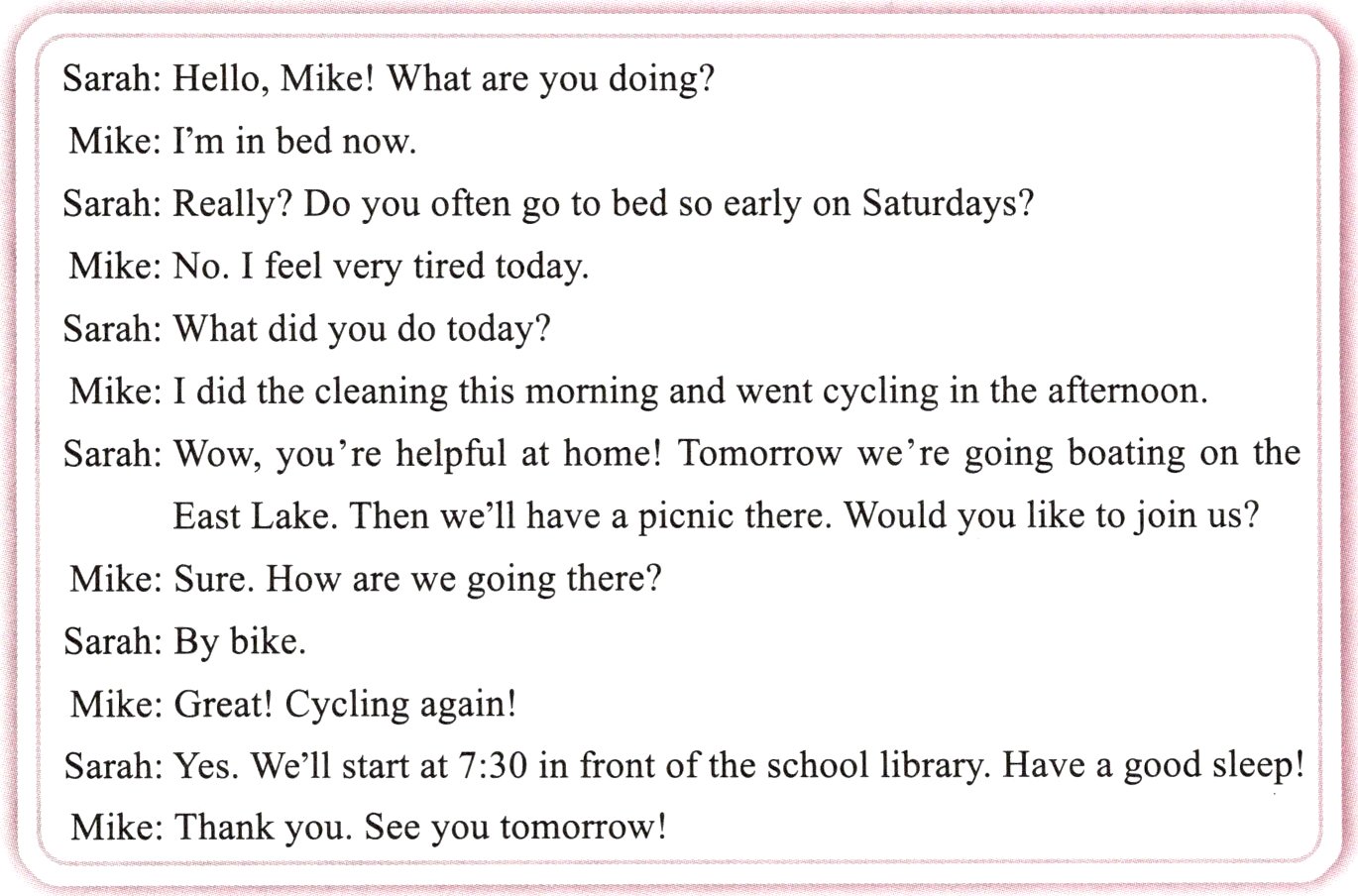 Sarah: Wow, you’re helpful at home! Tomorrow we’re going boating on the East Lake. Then we’ll have a picnic there. Would you like to join us?