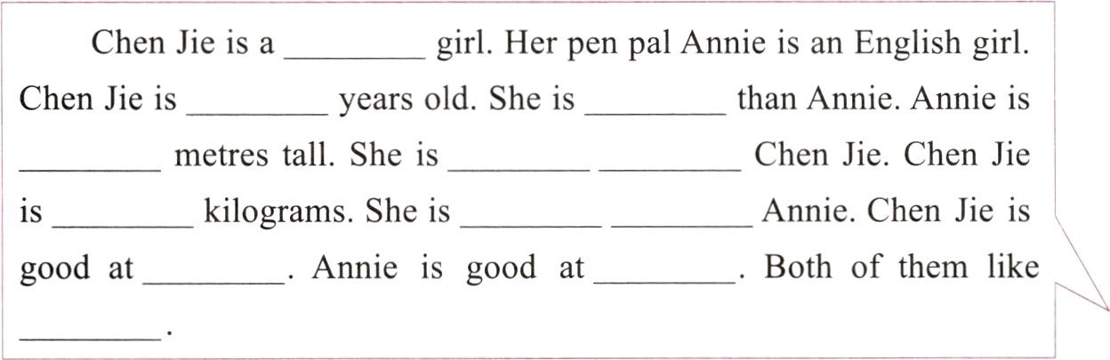 Chen Jie is a ______ girl. Her pen pal Annie is an English girl. Chen Jie is ______ years old. She is ______ than Annie. Annie is ______ metres tall. She is ______ ______ Chen Jie. Chen Jie is ______ kilograms. She is ______ ______ Annie. Chen Jie is good at ______. Annie is good at ______. Both of them like ______.