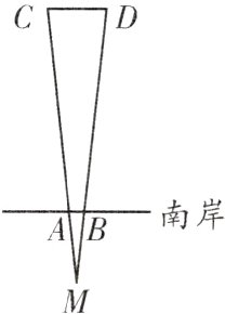 6. 如图,一条河的两岸有一段是平行的,在河的南岸岸边每隔5 m有一棵树,小奥站在离南岸20 m的点M处看北岸,在两棵树之间的空隙中,恰好看见一条船的船头和船尾(假设船头、船尾和小奥的眼睛位于同一水平面内),若已知船长CD = 18.5 m,该船行驶在河的中心,且船与河岸平行,求河的宽度.