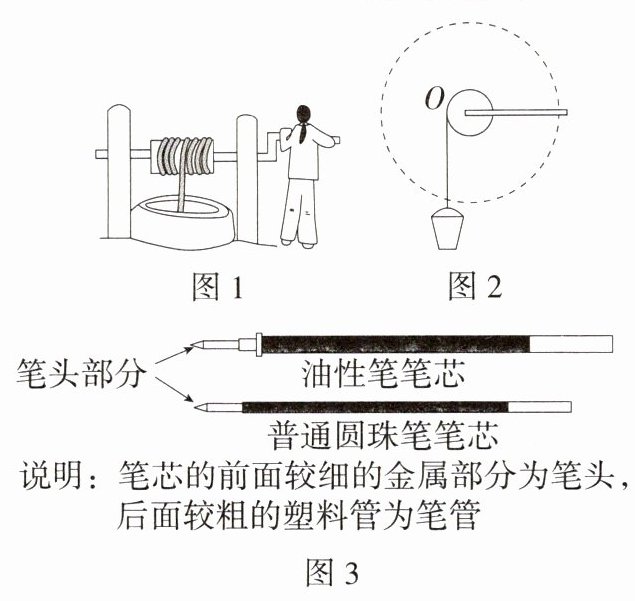 选用身边的器材探究轮轴的特点完成实验,如:圆珠笔芯(可以选用油性笔笔芯或普通圆珠笔笔芯,如图3所示),若手头没有圆珠笔笔芯也可以选用其他一头粗一头细的笔代替。该实验不考虑摩擦力不同、笔头相对于笔管转动对结果的影响。