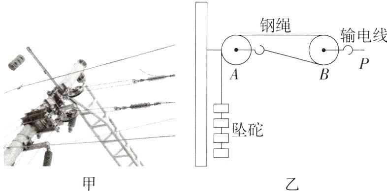 解析:由图乙可知,滑轮A为定滑轮,可以改变力的方向;滑轮组承担P端拉力的绳子股数n = 2,图乙中坠砣挂在钢绳的自由端,不计滑轮和钢绳自重及摩擦,则G = $\frac{1}{2}$Fp,则输电线P端受到的拉力Fp = 2G = 2×40000N = 8×10⁴N。