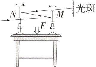 (2)桌面中间受到压力时,若桌面发生了形变,M和N会向中间倾斜,使入射角都变小,由于反射角等于入射角,则反射光会靠近法线,光斑向下移动,所以看到光斑向下移动说明桌面发生了形变;