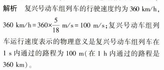 2.(新独家原创)我国自主研发的复兴号动车组列车,被誉为“中国速度”。经了解,复兴号动车组列车运行速度可达360____,合____m/s,表示的物理意义是________________。(P8202001)