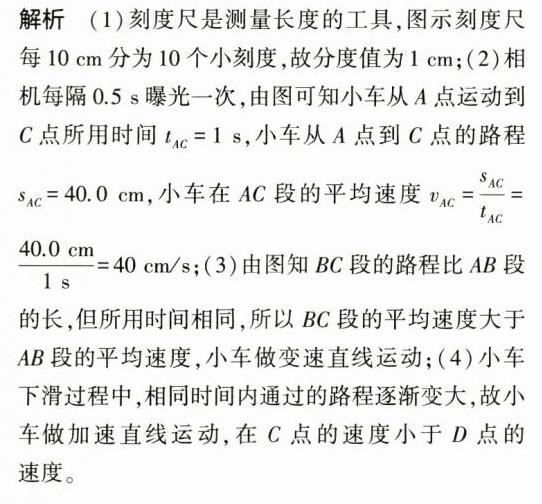 6.新中考.分析论证(2024广西浦北期末)频闪拍摄是研究物体运动的方式之一。某科创小组用频闪拍摄的方法来“测量小车运动的平均速度”。让小车在斜面上下滑,他们用相机每隔0.5s曝光一次,拍摄了小车在斜面上下滑的频闪照片如图所示。请根据照片信息回答下列问题。(P8202003)