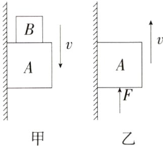9. 新课标.科学推理)(2024安徽C20教育联盟模拟,14,)如图所示,铁块A重4N,静止地吸附在竖直放置的磁性黑板上,将重为2N的木块B放在铁块上面时,恰能一起沿着黑板面缓慢匀速下滑。取走木块B,用竖直向上的力F推铁块,使其匀速向上运动(磁性黑板对A的作用力大小不变),则F的大小为(P8202002)( )