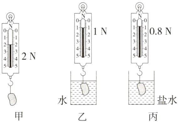 解析:由图甲知石块的重力:G = 2N,由图乙知石块浸没在水中受到的拉力:F拉 = 1N,所以石块在水中受到的浮力:F浮 = G - F拉 = 2N - 1N = 1N;石块浸没在水中时,由阿基米德原理可得石块排开水的体积:V排 = $\frac{F浮}{ρ水g}$ = $\frac{1N}{1.0×10³kg/m³×10N/kg}$ = 1×10⁻⁴m³;由图丙可知,石块浸没在盐水中时受到的拉力F拉′ = 0.8N,则石块受到盐水的浮力:F浮′ = G - F拉′ = 2N - 0.8N = 1.2N,因石块浸没在盐水中,则石块排开盐水的体积与排开水的体积相同,都为1×10⁻⁴m³,则盐水的密度:ρ盐水 = $\frac{F浮′}{V排g}$ = $\frac{1.2N}{1×10⁻⁴m³×10N/kg}$ = 1.2×10³kg/m³。