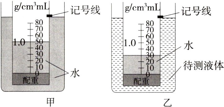 7. (2024安徽合肥模拟)某科技小组的同学想制作一个简易的密度计来测量液体的密度。他们取了一个上端开口,底部有配重的薄壁玻璃筒,侧壁标有0 - 80mL体积的刻度线,将空玻璃筒开口向上放入水中,玻璃筒竖直漂浮。向玻璃筒内加水至50mL刻度线时,在玻璃筒与外侧水面相平处做记号线,如图甲所示。将空玻璃筒开口向上放入待测液体中,向玻璃筒内加水至30mL刻度线时,外侧待测液体液面恰好与玻璃筒记号线相平,如图乙所示。已知玻璃筒重0.5N,水的密度为1.0g/cm³,g取10N/kg。