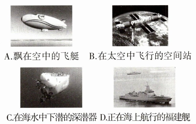 B 飘在空中的飞艇受到空气的浮力;太空中是真空的,在太空中飞行的空间站不受浮力;在海水中下潜的深潜器受到水的浮力;正在海上航行的福建舰受到海水的浮力;故选B。