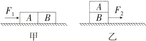 如图甲所示,完全相同的木块A和B紧靠在一起平放在粗糙程度相同的水平桌面上,在20N 的水平推力F₁作用下一起向右做匀速直线运动。若将A、B叠放到该桌面上,用水平力F₂拉着B使它们一起向右做匀速直线运动(如图乙所示),下列分析正确的是(P8202002) (