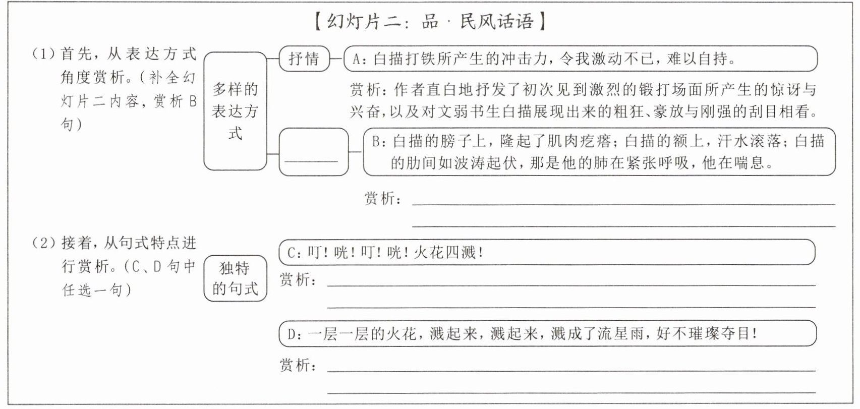 @@示例一:C句,拟声词和短语搭配感叹号,表现出打铁场面的激情四射,读来铿锵有力,增强了文章的气势,使读者有身临其境之感。
