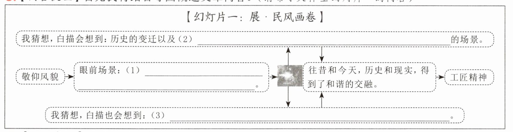 班级正在开展“走进民风民俗散文”阅读研讨会,以下是小文为这篇文章准备的部分幻灯片页面,请你参与研讨。