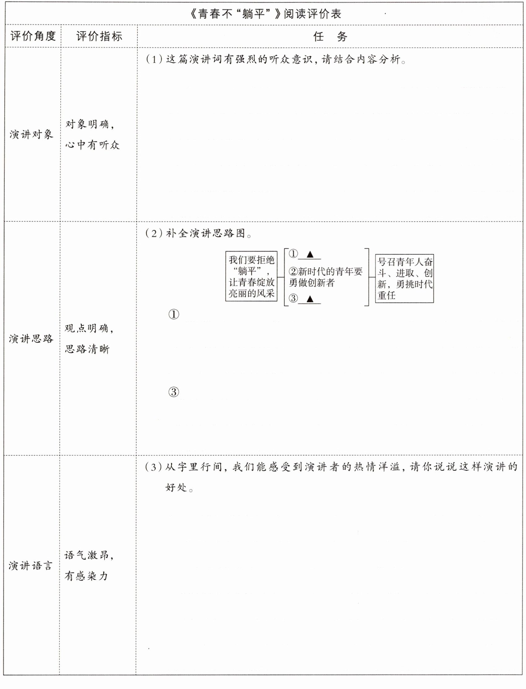 19. 班级将举办演讲比赛,小语找来一篇演讲词,想从中学习如何写好演讲词,让我们和他一起完成下面的阅读评价表。