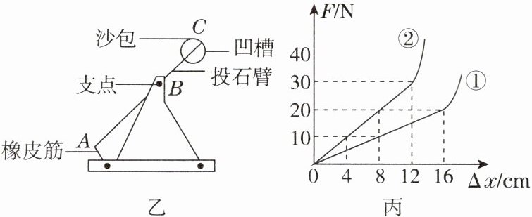 (1)图丙是两根长度和粗细均相同的不同品牌橡皮筋受到的拉力F和橡皮筋伸长量Δx的关系图像。在弹性限度内,若橡皮筋的伸长量保持不变,为了将沙包投射得更远,实践小组的同学应该选用橡皮筋______(填“①”或“②”)来制作投石机;