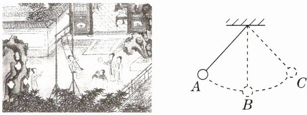 8. (跨学科·美术)《清明上河图》生动记录了中国十二世纪北宋都城汴京的城市面貌和当时人民的生活状况。如图所示为《清明上河图》中荡秋千的场景,当人从一侧的最高点A荡到另一侧的最高点C时,下列判断中正确的是( )
