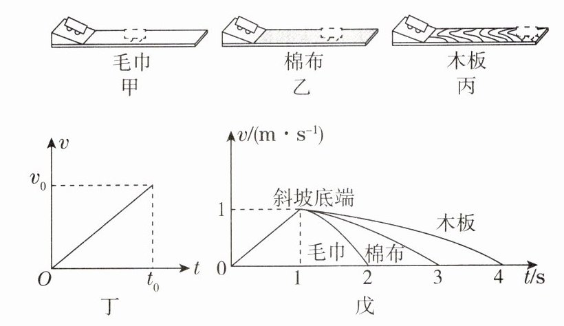(2)小车在水平面上的v - t图像如图戊所示,小车在水平面运动的过程中,所受阻力越小,减速越______(填“快”或“慢”)。