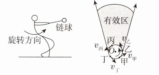 12. [科学推理] 链球比赛要求运动员站在一定直径内的圆圈中,两手握着链球把手,经过预摆和 3~4 圈连续加速旋转及最后用力,将链球掷出。球落在规定的有效区内,成绩方为有效。如图,小丁站在$O$点位置,以逆时针方向旋转抛掷链球。试分析:小丁应在____处时将链球脱手,才能最大程度确保链球落于有效区内,选择该处的原因是____。