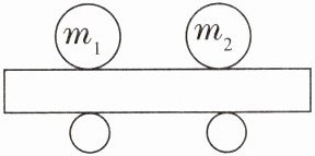 10. 如图所示,在一辆放在水平地面上的表面光滑的小车上,静止放置质量为$m_1$、$m_2$的两个小球($m_1>m_2$)。当小车从静止突然水平向右运动时,则两个小球( )