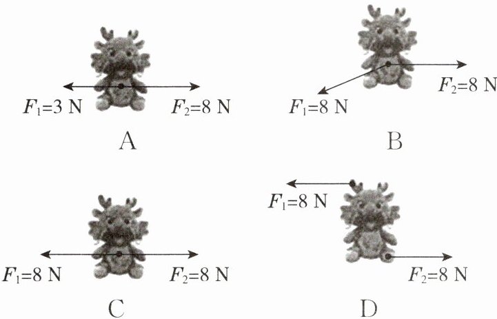 4. 图中作用在小金龙玩偶上的两个力$F_1$、$F_2$,属于一对平衡力的是 ( )