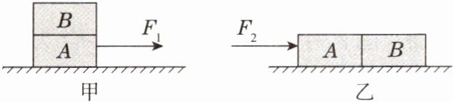 4. 如图甲所示,完全相同的木块$A$和$B$叠放在水平桌面上,在$12\ N$的水平拉力$F_{1}$作用下,$A、B$一起做匀速直线运动,此时木块$A$所受桌面的摩擦力为______ N;若将$A、B$紧靠着放在水平桌面上,用水平力$F_{2}$推$A$使它们一起匀速运动(如图乙所示),则推力$F_{2}=$______ N。
