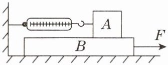 6. 如图所示,木板$B$在$F = 5\ N$的水平拉力作用下沿水平方向做匀速直线运动,此时弹簧测力计示数是$2\ N$,则木块$A$受到的摩擦力是______ N,方向是____________;当$F$增大到$7\ N$时,木块$A$受到的摩擦力________(填“变大”“变小”或“不变”)。
